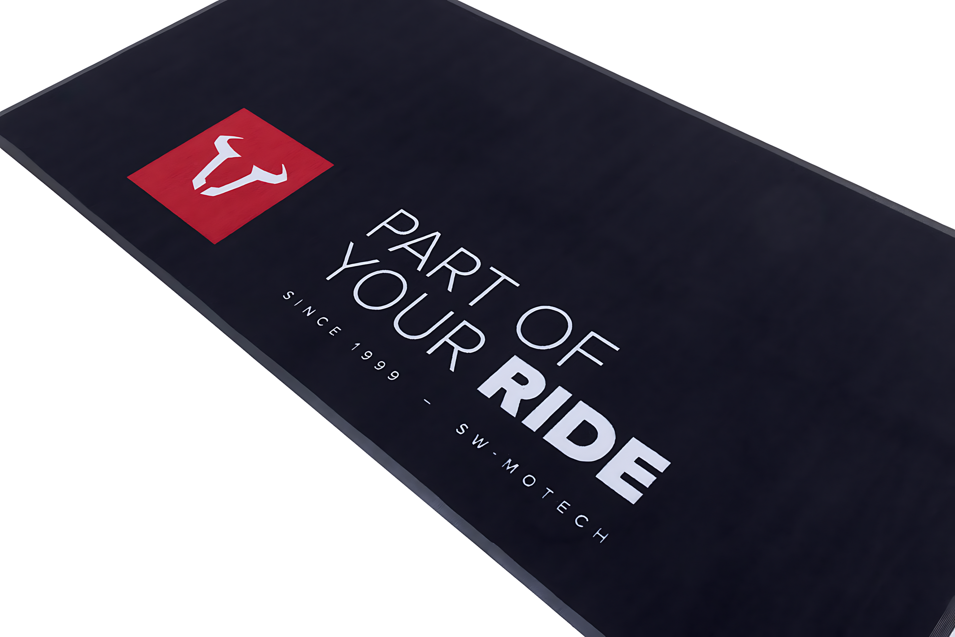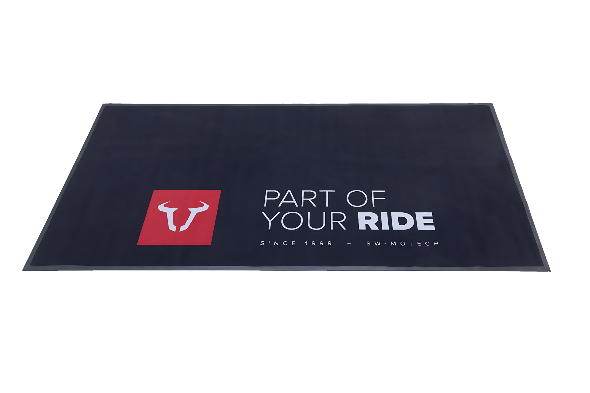 La alfombra para motos con el gran logotipo de SW-MOTECH llama la atención en una sala de exposición, el box o el taller. No solo tiene un diseño atractivo, sino que también convence por las excelentes propiedades del material. Esta alfombra resistente al fuego absorbe aceite, agua y polvo y cumple con las normas de la FIM.