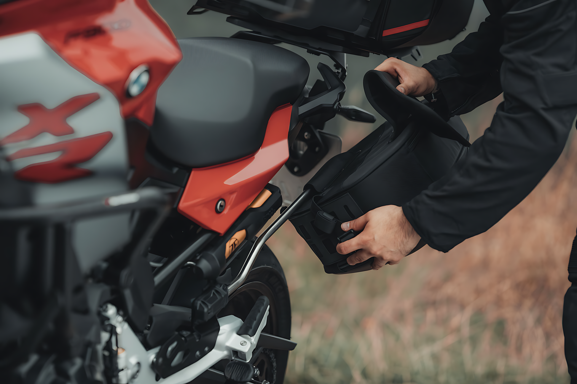 - Las alforjas PRO BLAZE con barras separadoras específicas del modelo le permiten convertir rápidamente su motocicleta deportiva en un vehículo para viajes de ocio.