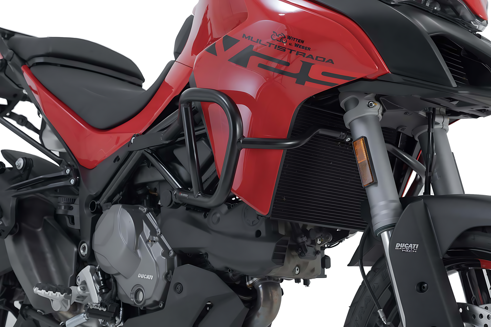 Las protecciones laterales de motor fabricadas a medida para la Ducati Multistrada 1200/ 1260/ 950/ V2 están hechas a partir de un tubo de acero de 22 / 27 mm de diámetro, en color negro, con recubrimiento de polvo resistente a la intemperie y a la corrosión. El acabado de la superficie se lleva a cabo en una instalación de última generación en la planta de SW-MOTECH en Brno en la República Checa.