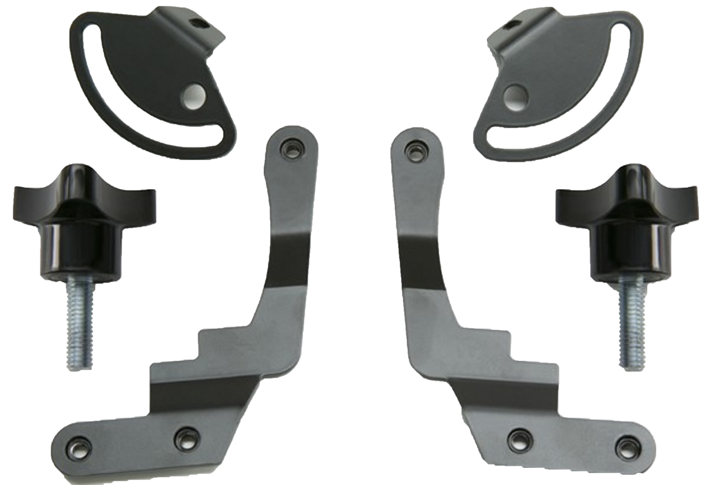 El soporte estabilizador se instala fácilmente y es totalmente compatible con la altura del parabrisas OEM ajustar hardware. Simplemente afloje las dos perillas del estabilizador, ajuste el parabrisas como lo hace normalmente, vuelva a apretar las dos perillas, y listo.